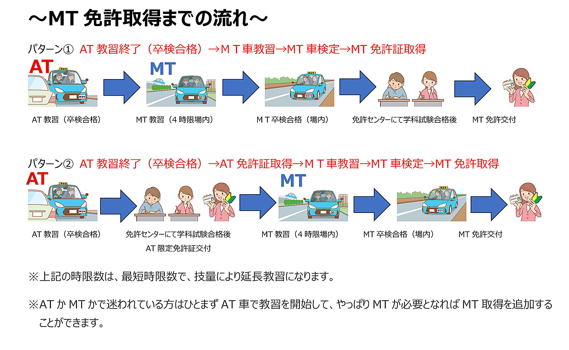 MT免許が必要な方は、AT限定免許を取得後にAT限定解除での対応となります。